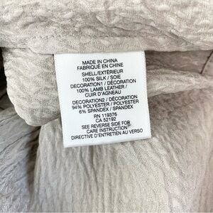 This beautiful piece features a 100% silk material, lamb leather trim, split side seams, and a high-low hem.