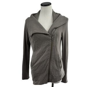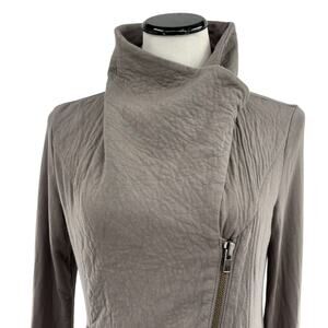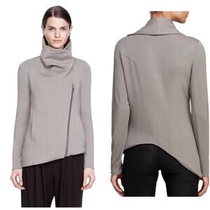 Gray moto biker jacket from Helmut Lang. Off center front zip. Hook and eye closure fastens the loose stand collar. Curved seam flatter the fit. Asymmetrical hem. Welt front pockets. Double layered. Can be worn three ways. Open, partially zipped, or zipped and hooked shut. Long sleeves. Lined. Rayon / spandex. Dry clean only. In preowned condition, some minor fabric wear. Inner brand tag has come undone on one side.