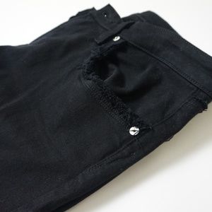 Black washed women's raw edge jeans from Helmut Lang cut a skinny fit and feature fringed detail to the leg cuffs and pockets.