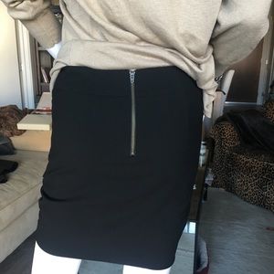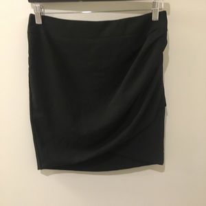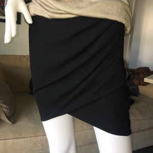 Heimut Lang black wool gaberdine skirt with side drape detail and exposed back zipper. 17” long.