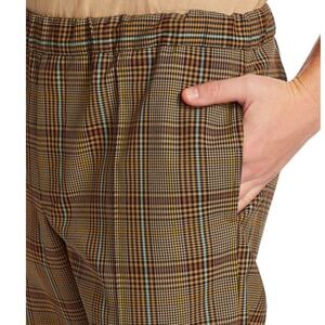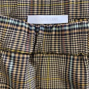 Helmut Lang flat front pant with zipper and elastic waist. 2 pockets in front and back. Tan, brown,, turquoise, yellow & black plaid made of polyester/ virgin wool blend. Men’s size Medium. Elastic waist measures 30-32 inches with a 28 inch inseam. In excellent condition!