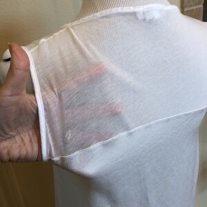 This is a classy edge to it. Sold and light as silk. Sections 100 cotton other sections 100 pct rayon, slightly sheer in areas. Only wore once and dry cleaned. No signs of wear.