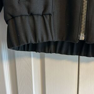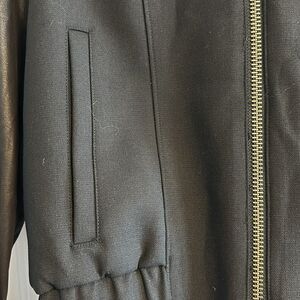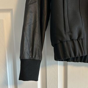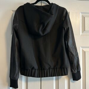 Helmut by Helmut Lang Women’s Black Hooded Jacket with Leather Sleeves. Zip closure.~22” shoulder to bottom hem and 18.25” pit to pit. Gently worn. Size M.