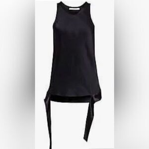This sleek black tank top by Helmut Lang features contrast draped hem with front tie. The sleeveless silhouette and smooth fabric offer a modern and minimalist look, perfect for a contemporary wardrobe. See photos for measurements.