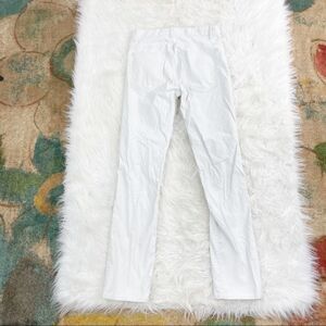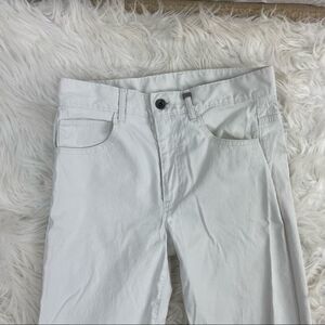 Helmut Lang casual straight leg pants size 4. White cotton/Elastane/rayon blend material with stretch. 5 pocket design with button and zipper closure. No holes on exterior one front pocket has shredded interior and 2 dots on back that can’t be seen when worn.