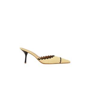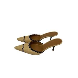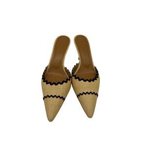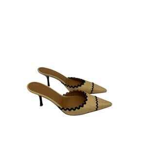 The Helsa Pin Heel Mule in Muslin Size 7 US / 37 EU, a sleek design that blends textile raffia on upper side with leather sole. Crafted in a metallic gold finish, these mules feature a sharp pin heel and open-toe silhouette, making them perfect for evening wear, weddings, or chic day-to-night styling. Condition notes: Stretching or Deformation
