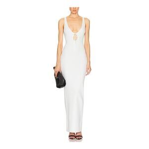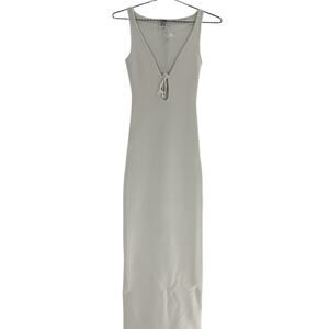 Helsa 'Teva' White Viscose Knit Dress Size XS: unlined, pull-on styling, keyhole cut-out at bust with tie closure, midweight slinky ribbed knit fabric, measurements: 12 inch bust x 53 inch length.