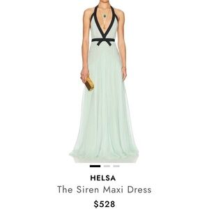 The Helsa Siren Dress is crafted from silk chiffon. This maxi dress is fully lined and features a halterneck hook and bar clasp closure, a hidden back zipper closure, a front V-neckline with bow detail and an open back.