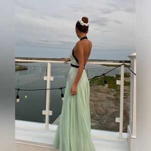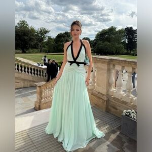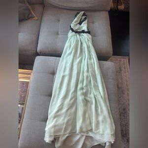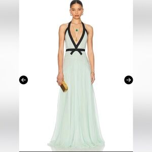 Purchased new for $528 and worn once. In great condition overall. Some small areas of discoloration at the bottom of the dress pictured. These should not be very noticeable when worn as dress is long and there is a lot of material. Also one area of pulling noted on the front. Again do not expect to affect wear. Price reflects!