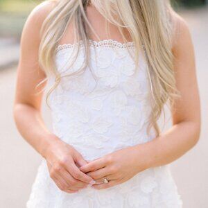 Size XS. Worn once for my engagement photos. Some length taken off of it to fit me (Lace detail is still perfectly in tact) The photo is of me and I am 5'2 for reference! So flattering and photographs wonderfully.