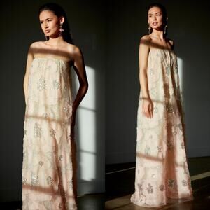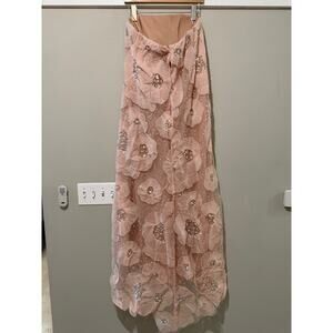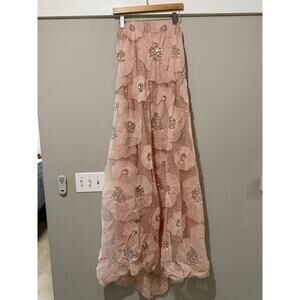 Helsi Margot Pink Pearl Gown. Women's Size S / Small. Features floral tulle fabric, with sequin and bead embroidery, strapless neckline, sleeveless, fitted stretch bodycon under dress, center back zipper closure, trapeze silhouette, long full length maxi dress. 100% polyester. Minor pilling on interior corset lining. Retail $695.