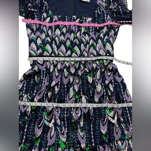 Make a show-stopping entrance in this dazzling Helsi mini dress, brand new with tags! This exquisite piece is a true work of art, featuring a stunning array of sequins and intricate embroidery in a beautiful palette of blues, greens, and silvers. The unique pattern creates a glamorous, almost feathered effect that shimmers with every movement. Designed with a chic square neckline and long sleeves that add a touch of sophistication, this dress is perfect for any special occasion. The flattering silhouette is cinched at the waist, leading to a playful mini skirt that's ready for dancing the night away. Whether it's a cocktail party, a holiday celebration, New Year's Eve, or a memorable night out, this Helsi dress is sure to turn heads!