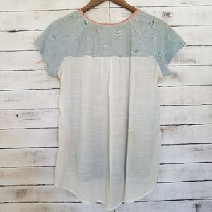 Hem & Thread short sleeve sheer linen back top with cute denim like distressed dots. Lightweight and flowy. Embroidered Aztec tribal collar. Good used condition. Please see photos.