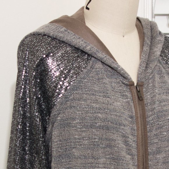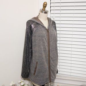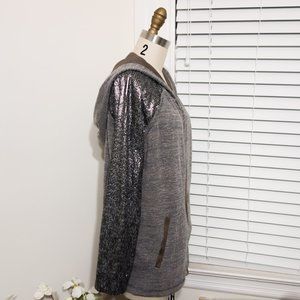Cute hoodie, perfect for a festival! Sequined arms and suede-like hoodie interior and details. Has pockets!
