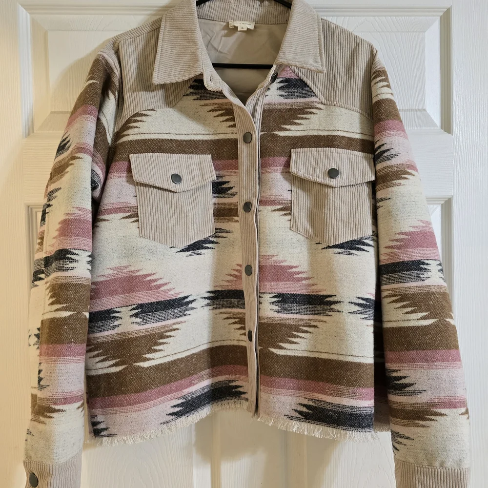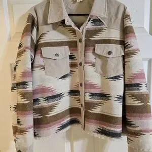 Chic utility jacket with Aztec-inspired design. Features button closure and dual chest pockets. Ideal for layering.