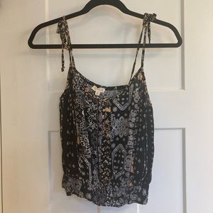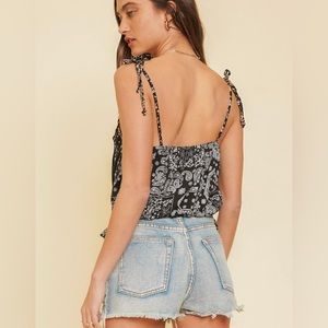 This little tank has self tying tassel straps with a beautiful black bandana print. It features an elastic bottom which will help it stay in place.