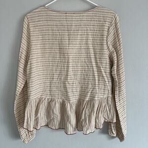 Hem & Thread Boho Peplum Ruffle Long Sleeve Pullover Top Sz L Beige Linen Cotton