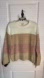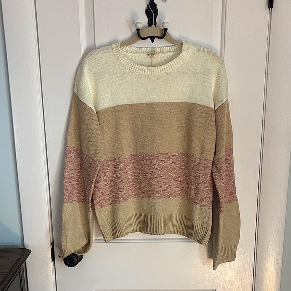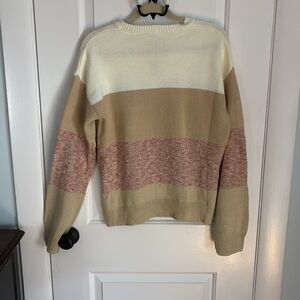 Stay cozy and stylish with this colorblock sweater featuring cream, tan, and pink hues. Perfect for any casual outing.