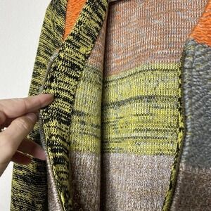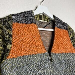 Beautiful sweater by Hem and Thread. Colorful cardigan with color blocked stripes in shades of gray, orange, yellow, tan, etc. Zip up closure. Almost thick enough to be a jacket. Super unique and fun! All measurements are approximate, taken flat and closed.