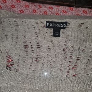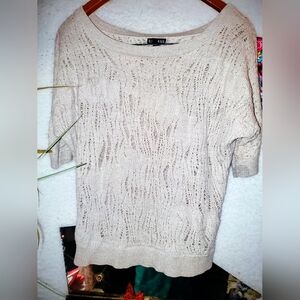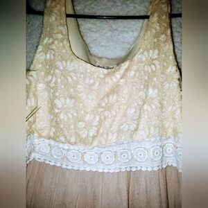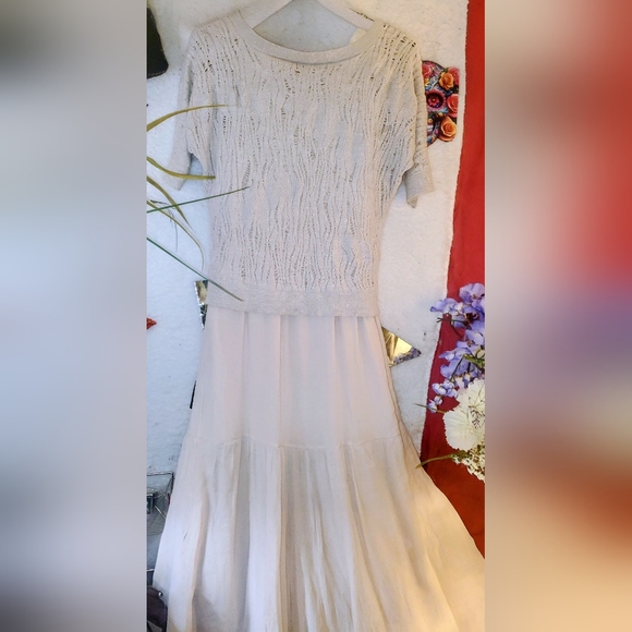 Elegant cream knit top and flowly dress. Short sleeves. Flowy skirt. Perfect for any occasion. Size Large by Hems and threads Sleeveless paired with a embedded lace blouse Express Size L made by Express. you can purchase separately just ask and ill make a separate listing all in mint condition.