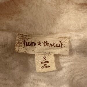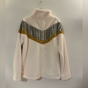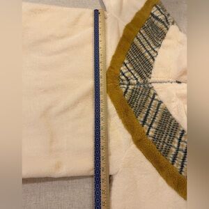 Cream faux fur body with neutral plaid and gold faux fur accents. Retro vibes. Quarter-zip pullover style with metal zipper and side pockets. Jersey knit feel lining.