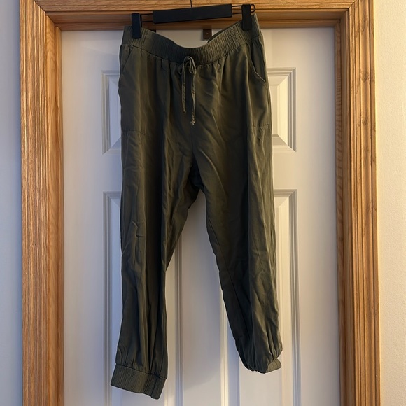 Size L (fits closer to medium) Hem & Thread army green joggers. 100% Rayon fabric.