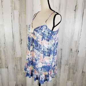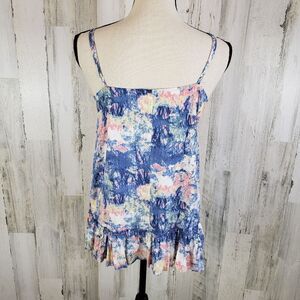 ~ Description: Blue, pink and ivory floral cami, ivory lace trim, button front, ruffle hem, adjustable spaghetti straps, non-stretch