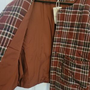 Chic rust plaid quilted fully lined jacket with button closure. Features two front pockets. Ideal for layering.