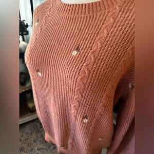 Hem & Thread Rust Sweater with Floral Accents Cable Knit