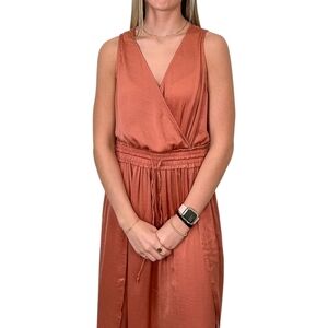 A beautiful earthtone dress that has a sense of calm and sophistication to any occasion. With its sleek and polished appearance, it's perfect for formal events, cocktail parties, or special evenings out. The lustrous sheen of the satin adds a touch of opulence, while the serene design and gentle lines create an aura of timeless elegance.