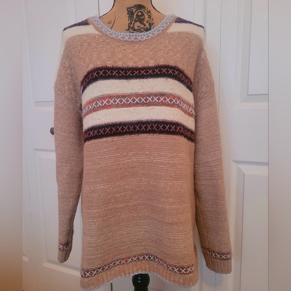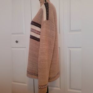 Warm crew neck tan sweater with bold stripes, fun pattern on chest, shoulders and trim. Longer style. Super soft.
