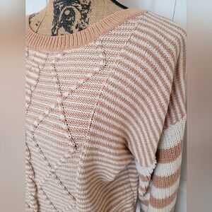 Cute crew neck sweater with beige and white stripes. Balloon sleeves, slightly cropped fit. Soft knit for comfort.