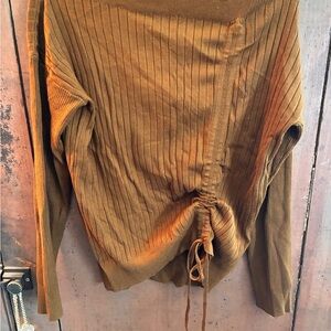 Cozy brown ribbed sweater with a cinching accent. Perfect for layering.