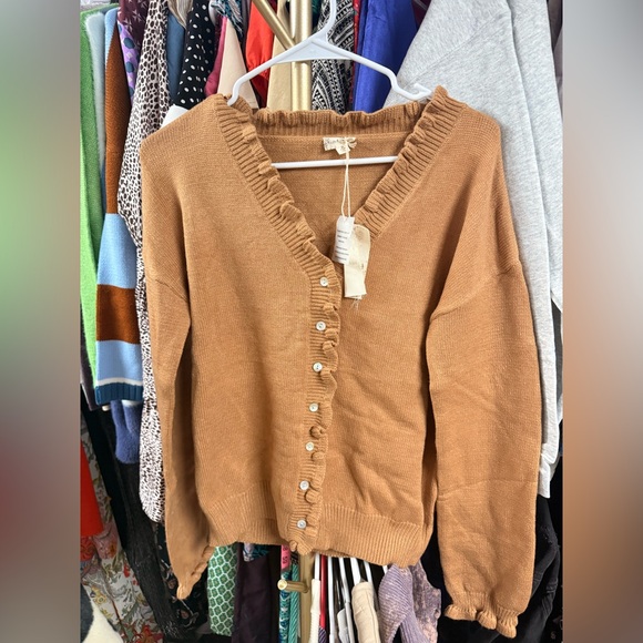 Stylish tan cardigan with ruffle trim. Features button-up design. Perfect for any occasion.