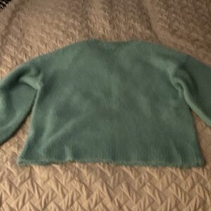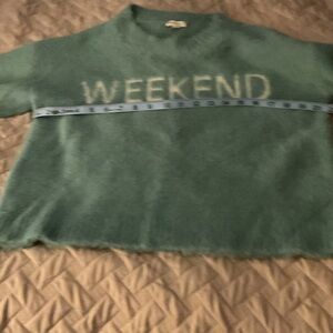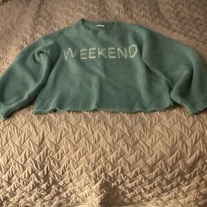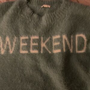 Soft teal sweater with 'Weekend' lettering. Ideal for relaxed days.
