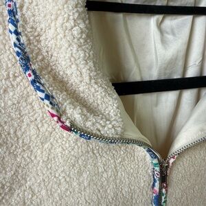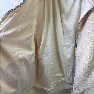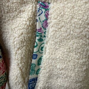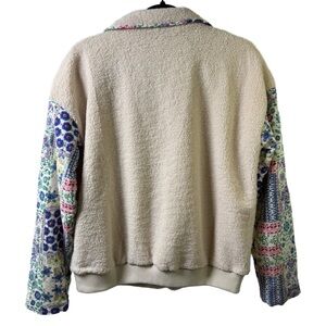 Cozy teddy jacket with vibrant patchwork sleeves. Features a zip-up front and soft texture. Ideal for a stylish, warm look. Lined in satin and very comfortable