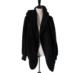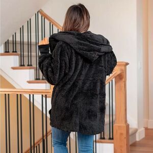 This is that cozy jacket you will throw on every day and go! One size fits most with an open neckline and long sleeves and side pockets.