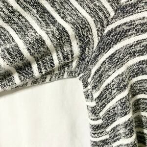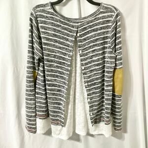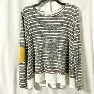 Hem & Thread brand. Women's large. Adorable stripe-heather knit dark top with button back and lacy light embellishment at the bottom and back. Mustard yellow/gold suede-like elbow patches. Raw hem. Button up the back buttons to hide or reveal more of the cream-colored lacy fabric. In preloved condition (see photos for condition, if applicable); as with any preowned clothes, you should wash before wearing the first time. Made of polyester, rayon, and cotton. From a pet friendly home.