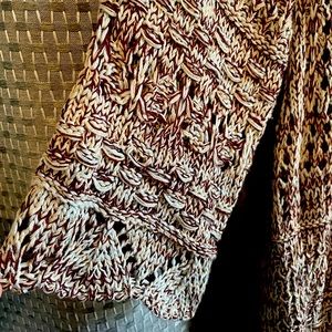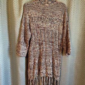 Loosely woven long fringed cardigan. Perfect transition to spring. Beautiful shades of brown, cream & pale bluish silver. 3/4 sleeve
