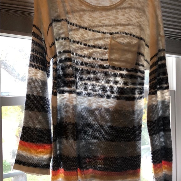 Excellent used condition only worn twice. This sweater sold out twice at my local boutique! Tho colors remind me of a sunset. It’s a large but I wore it as an oversized medium wit a bralette.