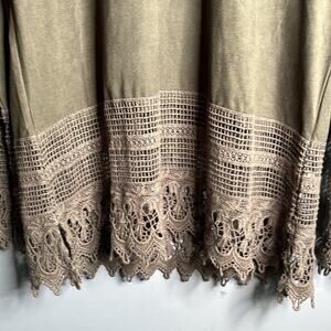 Super cute brown long sleeve top from Hem and Thread. Crochet bottom of the top and sleeves. Flowy sleeves. Round neckline.