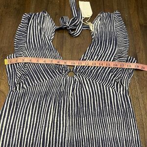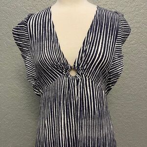 This white and navy relaxed fit dress has a plunging neckline and a front o-ring. Designed with ruffled cap sleeves a sultry side slit.