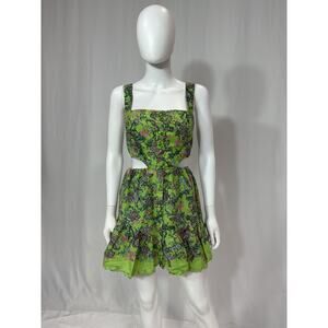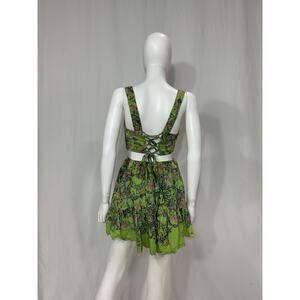 Hemant And Nandita 'Rhea' Green Mini Dress Size M: fully lined, back tie closure, waist and back cut-out design, medium weight linen fabric with ruffles at the hem.