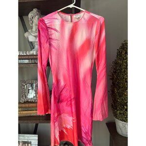tags: revolve, fwrd, designer, mini, satin, silky, floral, abstract, retro, mod, cocktail, party, wedding guest, bell sleeve, sheath, sexy