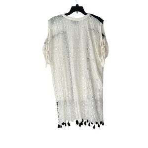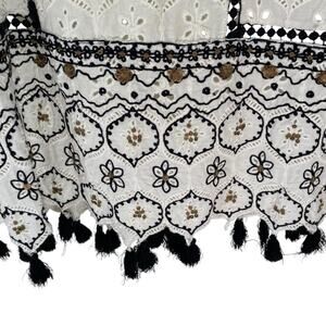 Hemant & Nandita Anthropologie Aditya Embroidered Eyelet Cover Up Swim Large Cream and black - in good condition. One of tassels is missing off bottom and also at toes. Sheer. Measurements laying flat chest 23 inches across and length 37 inches long