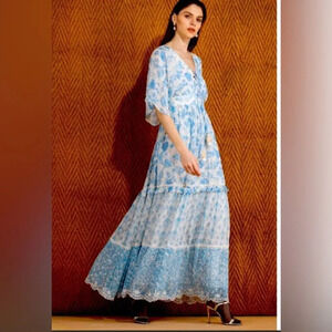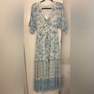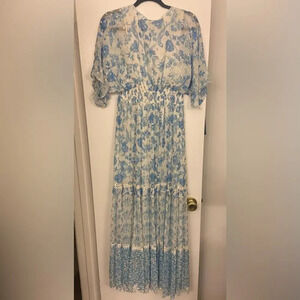 Hemant & Nandita Calee Pleated Long Dress Blue & White Size Small. New with tags. There is a very small snag near the sleeve, not too noticeable. Small fits sizes 2-4 Bust 34-35 Waist 26-27 Hip 36-37.