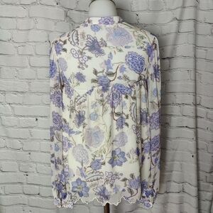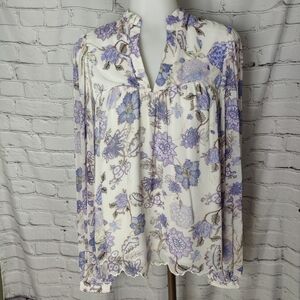 This Hemant & Nandita Dija Boho top is a stunning addition to any wardrobe. The white and iris floral pattern is perfect for any season and the sheer long balloon sleeves and v-neckline add a touch of elegance.