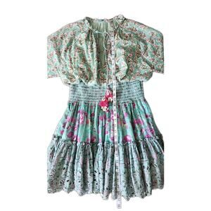 The Hemant & Nandita Hera Long Sleeve Floral Mini Dress in Mint Macaron, size M, is a vibrant and charming piece perfect for various occasions. Made from 100% cotton, this dress features a beautiful floral pattern with tasseled and embroidered accents, adding a touch of bohemian flair. The long sleeves and split neckline with a pullover closure make it easy to wear, while the smocked and lined details ensure comfort and quality. This handmade dress from India is ideal for summer and spring events, exuding a cottagecore style that is both whimsical and elegant.
