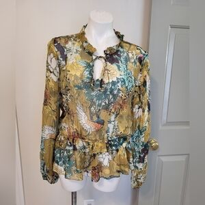Hemant & Nandita Keystone Silk Blouse Sheer Floral Print Feminine Peplum(L)