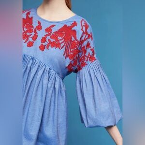 Hemant & Nandita Lianna Bubble Sleeve Embroidered Top Red Blue XS
